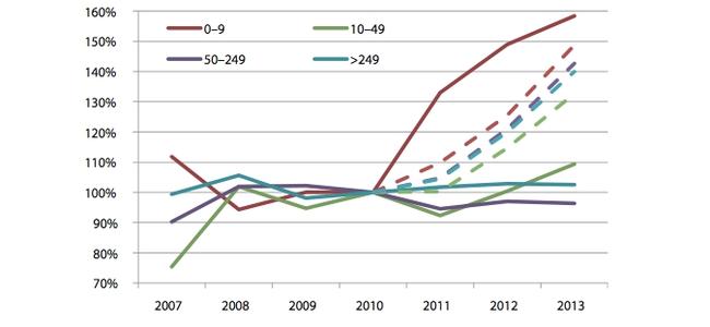 Obserwujemy, że coraz więcej jest firm małych, kilkuosobowych w miejsce mikrofirm. Wzrost liczby tych pierwszych mieści się w okolicach 6 p.p., co jest niewysokim odsetkiem, ale w przeliczeniu na liczby bezwzględne daje całkiem sporą grupę firm i odczuwalną tendencją.