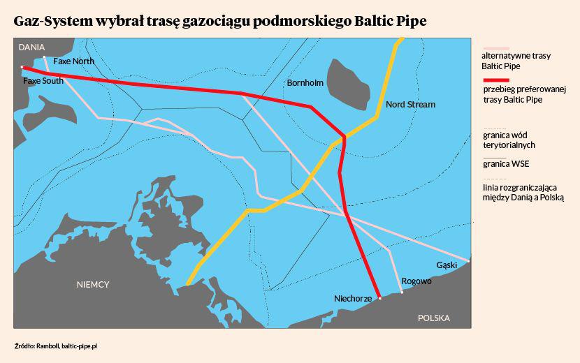 Gaz-System, państwowa firma zarządzająca krajową infrastrukturą gazową, wybrała trasę dla gazociągu podmorskiego Baltic Pipe, który ma umożliwić Polsce import gazu z Norwegii. Flagowa inwestycja energetyczna rządu będzie biegła przez duńskie i polskie obszary morskie oraz szwedzką wyłączną strefę ekonomiczną. Na ląd gazociąg ma wyjść w Faxe South w Danii oraz w Niechorzu- Pogorzelicy w Polsce.