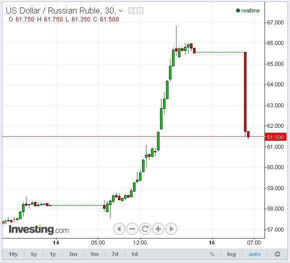 Zaskakująca podwyżka zahamowała tylko na godzinę trwającą od sześciu dni przecenę rubla.