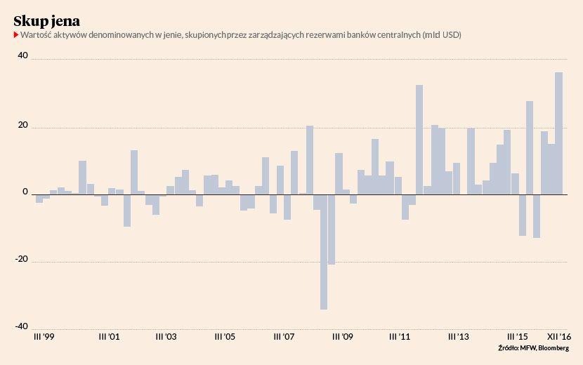W ostatnich trzech miesiącach 2016 r. zarządzający rezerwami walutowymi banków nabyli denominowane w jenie aktywa na kwotę 35,3 mld USD, oblicza agencja Bloomberg na podstawie danych MFW. W ten sposób instytucje zareagowały na popyt na dolara ze strony japońskich inwestorów, który w czwartym kwartale wyniósł kurs dolara do jena o 15,2 proc.