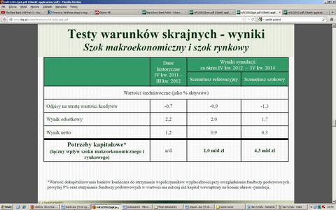 W scenariuszu referencyjnym banki będą potrzebowały 1 mld zł dodatkowego kapitału na koniec 2014 r. Gdyby doszło jednak do poważnego załamania, wtedy potrzeby kapitałowe wzrosłyby do 4,3 mld zł. Sporo, ale fundament kapitałowy wciąż byłby stosunkowo mocny (łączna wartość kapitałów obecnie to około 100 mld zł). Mocniej w banki uderzyłby kryzys od strony płynnościowej. NBP w scenariuszu szokowym założył, że z sektora odpływają niestabilne depozyty gospodarstw domowych, przedsiębiorstw i samorządów o terminie zapadalności. Dodatkowe każda z tych grup klientów wycofuje dodatkowo 5 proc., 10 proc. i 10 proc. swoich depozytów.