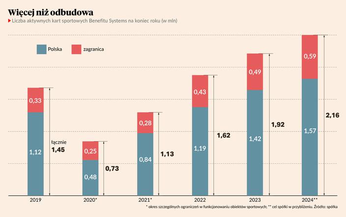 W obliczu pandemii COVID-19 branża fitness, której Benefit jest w Polsce wyraźnym liderem, musiała na długo poważnie ograniczyć, a nawet wstrzymać działalność. W efekcie liczba kart sportowych spółki spadła w 2020 r. o połowę, do ok. 0,7 mln. Jednak już w 2022 r., wraz z odbudową całego rynku, była wyższa niż przed pandemią, a miniony rok to śrubowanie rekordu – 1,9 mln kart, z czego 1,4 mln w Polsce. W ciągu trzech kwartałów 2023 r. firma osiągnęła 2 mld zł przychodów i 587,9 mln zł zysku EBITDA. To więcej niż w całym 2019 r., kiedy przychody wyniosły 1,5 mld zł, a EBITDA 357,9 mln zł.