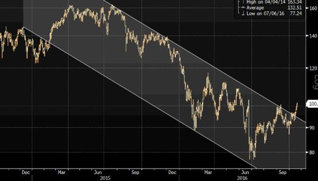 Przeciwnego zdania jest jednak Barry Bannister, główny strateg rynku akcji w banku Stifel Nicolaus, zdaniem którego indeks Euro Stoxx Banks wszedł w hossę, po tym jak na jego wykresie pojawiła się formacja podwójnego dna. Do połowy 2018 r. branżowy subindeks ma szanse wzrosnąć o połowę, jeśli tylko problemy banków niemieckich i włoskich zostaną rozwiązane. Do podobnych wniosków prowadzić może także fakt, że notowania indeksu wybiły się górą z kanału spadkowego (wykres poniżej).
