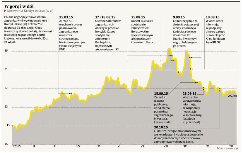 Rynek nic o tym nie wiedział, a kurs KI i tak systematycznie rósł — od 19 zł za walor na początku roku do rekordowych 35,66 zł w sierpniu. Pomagał dobry klimat wokół branży, a przede wszystkim plotki o możliwości wejścia inwestora, snute przez analityków i podsycane przez spółkę (w czerwcu 2015 r. Paweł Szewczyk, prezes KI, w wywiadzie dla portalu akcjonariat.pl powiedział, że są inwestorzy, którzy pytają zarząd spółki o „możliwości inwestycyjne na poziomie equity”). Z naszych informacji wynika, że jako drugi z procesu odpadł Lindorff. Najbardziej zdeterminowanym z oferentów był Cabot, a jego oferta wstępna, wedle informatorów „PB”, opiewała na około 33 zł za akcję.