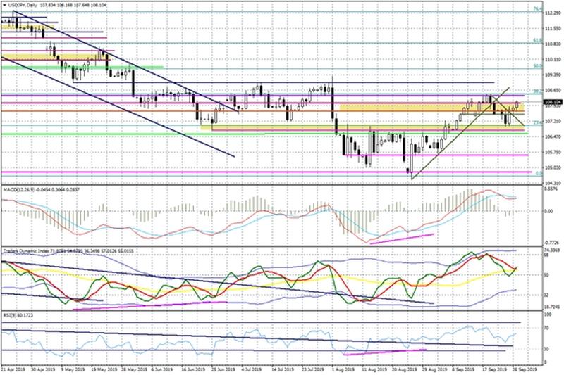 Na koniec tygodnia spójrzmy na wykres USDJPY, który jest też wypadkową nastrojów wokół ryzykownych aktywów. Widoczne ocieplenie na rynkach akcji po korekcie wywołanej obawami o impeachment Donalda Trumpa, przełożyło się dzisiaj na powrót notowań tej pary ponad poziom 108,00. Nie wyklucza to podejścia pod szczyt z 18 września przy 108,47, ale ruch ten będzie miał miejsce przy dywergencji na dziennych wskaźnikach, co może sugerować, że nie będzie trwały.