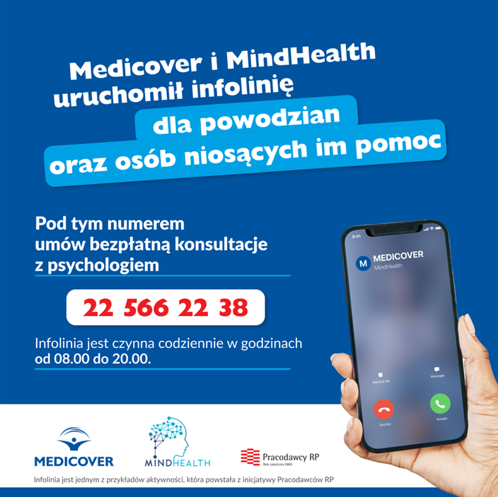 We współpracy ze swoją siecią Centrów Zdrowia Psychicznego MindHealth, Medicover uruchomił bezpłatny numer wsparcia psychologicznego dostępny dla powodzian: 22 566 22 38. Infolinia jest czynna w godzinach od 08.00 do 20.00. Obsługują ją wykwalifikowani specjaliści, niosący wsparcie osobom dotkniętym kryzysem psychicznym wywołanym sytuacją powodziową. Idea jej uruchomienia powstała z inicjatywy Pracodawców RP, której Medicover jest aktywnym członkiem.