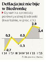 Notowana w Lizbonie spółka informuje, że zysk EBITDA Biedronki wyniósł 305 mln EUR, czyli około 1,25 mld zł. To o 8,6 proc. więcej niż w pierwszej połowie 2014 r. Jej rentowność na tym poziomie skurczyła się jednak o 0,2 pkt. proc., do 6,8 proc. — choć nadal jest najwyższa spośród wszystkich sieci w portfelu grupy. Spółka oczekuje, że w najgorszym wypadku, przy pogłębieniu deflacji, marża spadnie w tym roku do 6,5 proc. Pod kreską są najmłodsze biznesy Portugalczyków — Ara, czyli sieć dyskontów rozwijana w Kolumbii, i Hebe, czyli polskie drogerie. Ich łączna strata przekroczyła 29 mln EUR i do końca roku może sięgnąć 70 mln EUR. Nie powstrzymuje to jednak Portugalczyków przed inwestycjami. Na rozwój Biedronki od stycznia do czerwca wydano około 400 mln zł. Sieć otworzyła w tym czasie 83 sklepy, 15 placówek zostało zamkniętych. Na koniec półrocza działało ich 2655. Inwestorzy pozytywnie zareagowali na wyniki Jeronimo Martins — kurs spółki rósł w czwartek o ponad 4 proc. Od dołka z końca października ubiegłego roku notowania skoczyły już o 86 proc. Na zielono świecił też Eurocash, notowany w Warszawie największy hurtowy dystrybutor żywności. Jego kurs rósł o 3,5 proc., najmocniej w WIG20. © Ⓟ