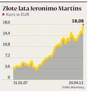Inwestowanie w Polsce się opłaca. Kurs akcji portugalskiego Jeronimo Martins (JM) na giełdzie w Lizbonie sięgnął wczoraj historycznego maksimum — rynkowa kapitalizacja spółki wynosi już ponad 11,3 mld EUR, czyli 47 mld zł. To o 13 proc. więcej niż warte jest PKO BP — największa spółka na warszawskiej giełdzie.