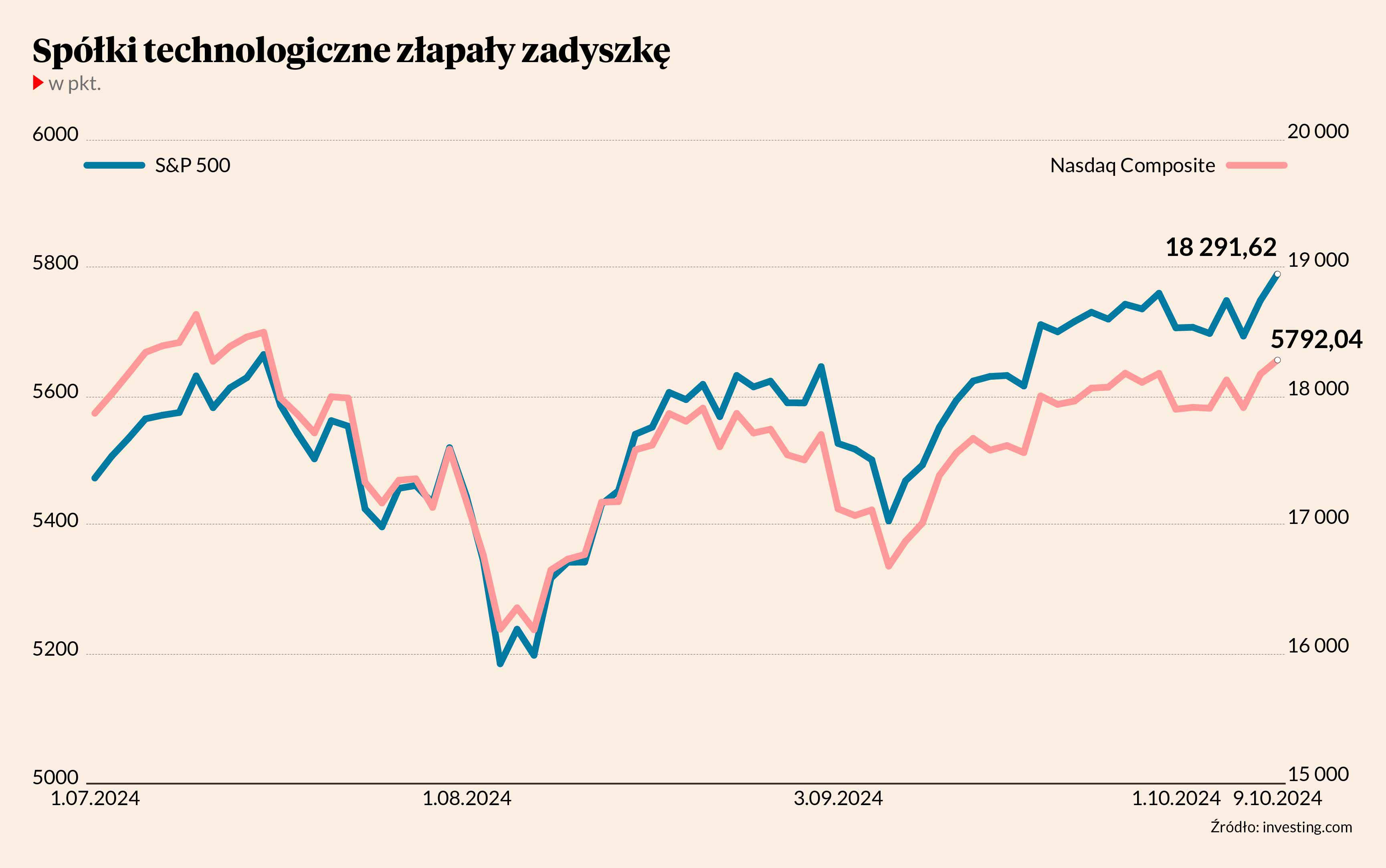Apple, Amazon, Alphabet (Google), Meta (Facebook), Microsoft, Nvidia oraz Tesla – to tzw. wspaniała siódemka, która długo odpowiadała za większość wzrostu na amerykańskim rynku akcji. Od kilku miesięcy skupiający technologiczną elitę Nasdaq jest jednak słabszy niż bardziej zdywersyfikowany S&P 500. Jedną z przyczyn może być rozpoczęcie cyklu luzowania polityki pieniężnej w USA, co przyciągnęło uwagę do pozostałych spółek.