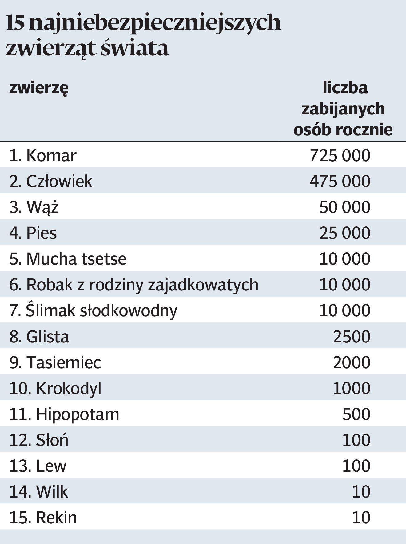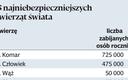 Rekiny mają na swoim koncie 10 ofiar. Tyle samo co wilki. Poziom wyżej z setką zabitych są słonie i lwy. Jeszcze wyżej, bo z tysiącem „na liczniku”, znajdują się krokodyle. I tak dalej i dalej aż do… komarów. Bill Gates, współzałożyciel koncernu Microsoft i najbogatszy człowiek świata, opublikował na swoim blogu gatesnotes.com listę najniebezpieczniejszych zwierząt, czyli takich, które zabijają rocznie najwięcej ludzi. Miliarder do zadania podszedł poważnie i do listy dodał infografikę: zwierzę i przybliżona liczba zabijanych ludzi. Gates korzystał m.in. z danych Światowej Organizacji Zdrowia, a wszystko przygotował w związku z ogłoszonym na swoim blogu „tygodniem komara”. Temat wbrew pozorom jest bardzo poważny. Genialny informatyk, który kiedyś zrewolucjonizował nasz sposób korzystania z komputerów, w ostatnich latach udziela się głównie jako filantrop. I to właśnie ta ostatnia funkcja popchnęła Billa Gatesa do zajęcia się tematem komarów.
