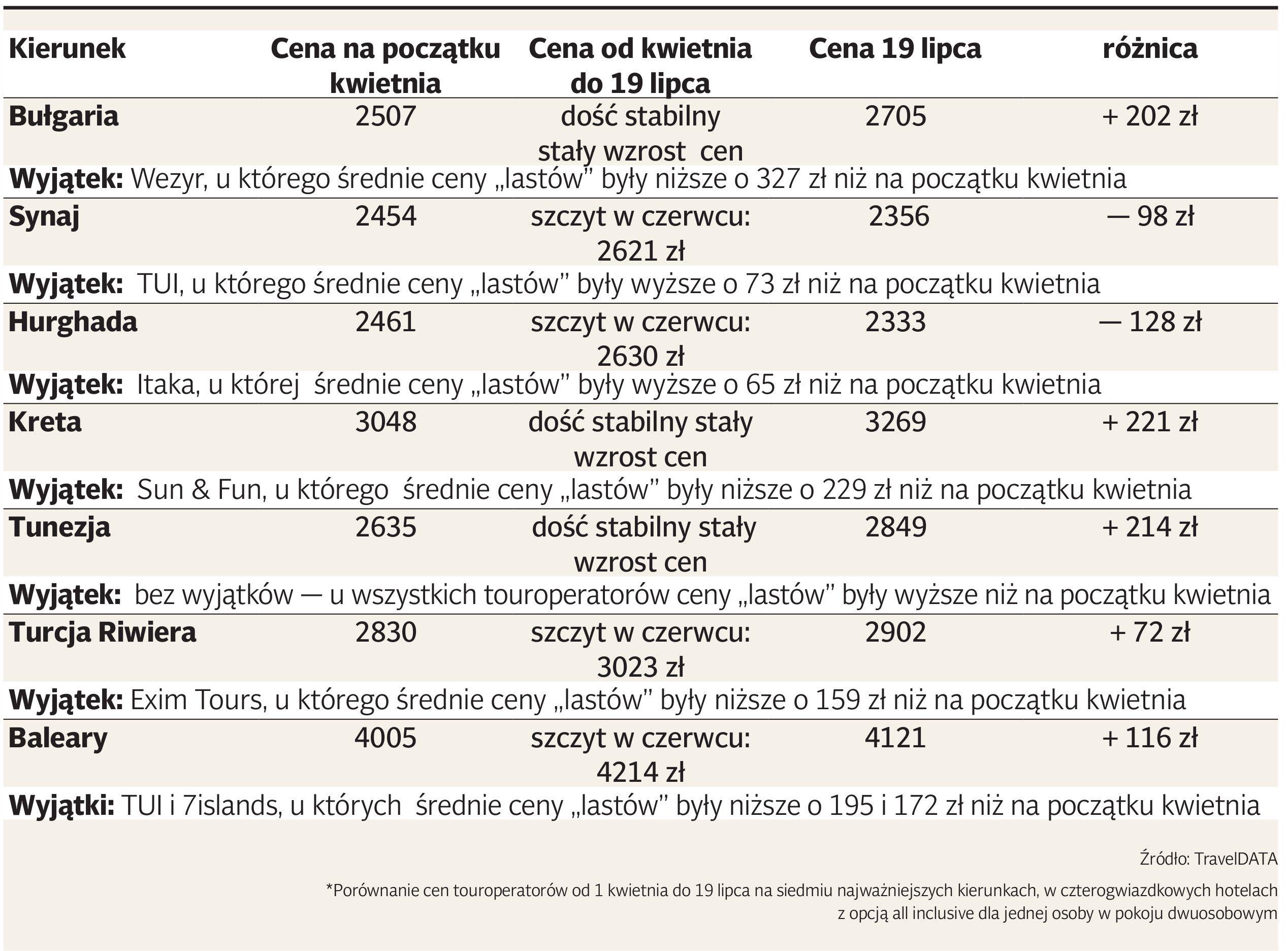 Wyliczenia opiera na porównaniu cen touroperatorów od 1 kwietnia do 19 lipca (bo wtedy wyjazdy w pierwszym tygodniu sierpnia stają się tzw. lastami) na siedmiu najważniejszych kierunkach, w czterogwiazdkowych hotelach z opcją all inclusive dla jednej osoby w pokoju dwuosobowym.
