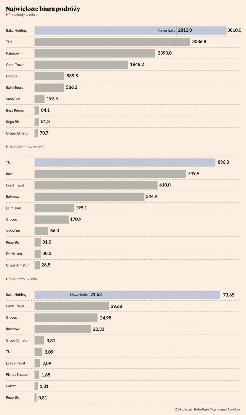 W 2022 r. 21 największych biur podróży miało 13 mld zł przychodów (wzrost o 77,4 proc. r/r), 3,4 mln klientów (wzrost o 56,4 proc.) i 160,7 mln zł zysku netto (spadek o 25 proc.) – wynika z danych Instytutu Badań Rynku Turystycznego TravelData. Itaka Holding miała 3,8 mld zł przychodów, drugi TUI 3,1 mld zł, trzeci Rainbow prawie 2,4 mld zł, Coral Travel 1,8 mld zł, a Grecos 589,5 mln zł. Pierwsza piątka biur odpowiadała 2,9 mln klientów.
