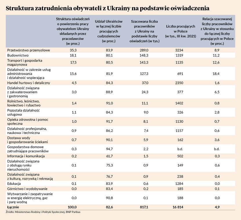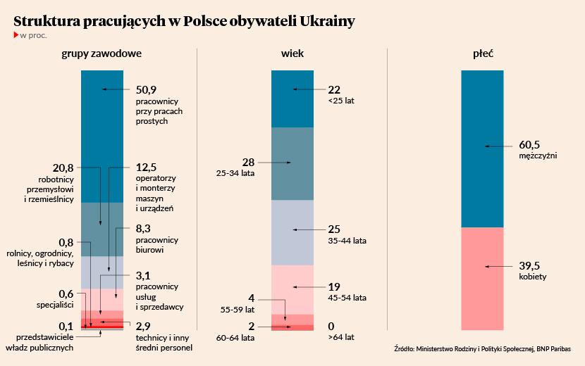 Część przybyszów szuka u nas zatrudnienia. Prof. Jacek Męcina, doradca zarządu Konfederacji Lewiatan, uważa, że sukcesem będzie podjęcie pracy przez połowę przybyłych do nas dorosłych osób. W 2021 r. 60,5 proc. zatrudnionych u nas Ukraińców stanowili mężczyźni, a 39,5 proc. kobiety. Zdaniem Michała Dybuły, głównego ekonomisty Banku BNP Paribas, wkrótce proporcje mogą się odwrócić.