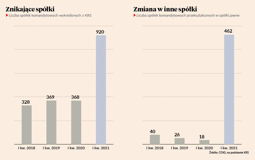 Zgodnie z przewidywaniami ekspertów rozpoczął się proces uciekania od spółek komandytowych, spowodowany ich podwójnym opodatkowaniem. W okresie styczeń - marzec 2021 r. z Krajowego Rejestru Sądowego (KRS) wykreślono 920 spółek komandytowych – niemal trzykrotnie więcej niż standardowo w analogicznym okresie lat wcześniejszych (I-III 2020: 368, I-III 2019: 369, I-III 2018: 328). Gigantycznie zaś wzrosło zainteresowanie zmianą formy prawnej spółki komandytowej. W I kwartale tego roku 462 zostały przekształcone w inne spółki, przede wszystkim jawne. To wzrost o ponad 2000 proc.