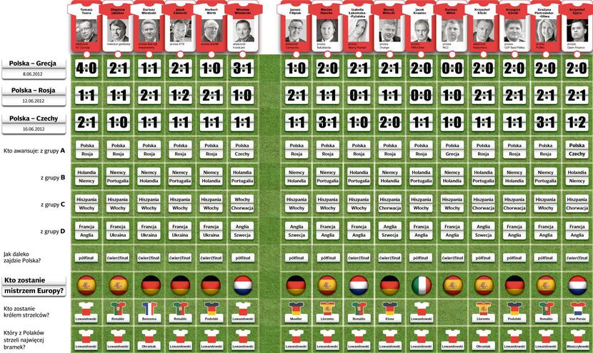 Wygrać mają Hiszpanie, Niemcy lub Holendrzy. Tylko Jacek Krawiec, prezes Orlenu, stawia na Włochów. Szans na wyjście z grupy nikt nie daje m.in. Duńczykom i Irlandczykom, mało kto wierzy w Greków i Czechów oraz Chorwatów. Królem strzelców (jeśli wierzyć naszym typującym, szczególnie paniom) będzie boski Cristiano Ronaldo. U nas najwięcej strzeli Robert Lewandowski. Za trafne typy jest do zdobycia łącznie 47 punktów, walka o zwycięstwo zapewne będzie trwała do końca. Klasyfikację na bieżąco będzie można śledzić w „Pulsie Biznesu” i na stronie EURO2012.pb.pl.