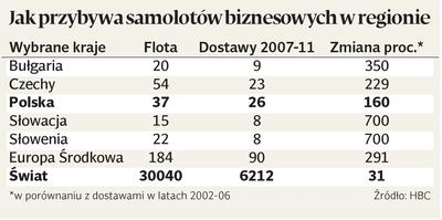 — Rynek lotnictwa biznesowego urósł gwałtownie przez pięć lat, choć baza była niska. Europa Środkowo-Wschodnia pozostaje dla nas ważnym regionem — mówi Scott Plumb z HBC. Największe zwyżki — o 700 i 350 proc. — zanotowały Słowenia, Słowacja i Bułgaria. Polska ma jednak drugą w regionie, po Czechach, flotę.