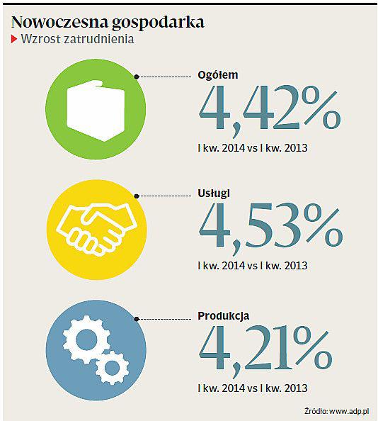 Najnowszy raport, dotyczący I kwartału 2014 r., przynosi kilka interesujących danych. Pierwszy raz od czterech kwartałów wzrost zatrudnienia w firmach usługowych nowoczesnej gospodarki był wyższy (4,53 proc.) niż w firmach produkcyjnych (4,21 proc.). A największy, nienotowany dotychczas skok zatrudnienia, odnotowały mniejsze przedsiębiorstwa produkcyjne, czyli zatrudniające do 500 pracowników (7,84 proc.). Za nimi uplasowały się mniejsze firmy usługowe (5,64 proc.).