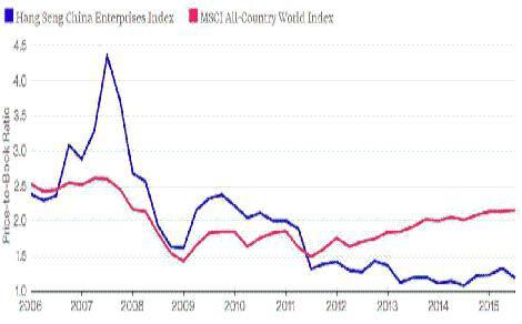 Wskaźnik cena/wartość księgowa dla Hang Seng China Entreprises (linia granatowa), na tle tego samego wskaźnika dla globalnego indeksu MSCI All Country World. Źródło: Bloomberg.