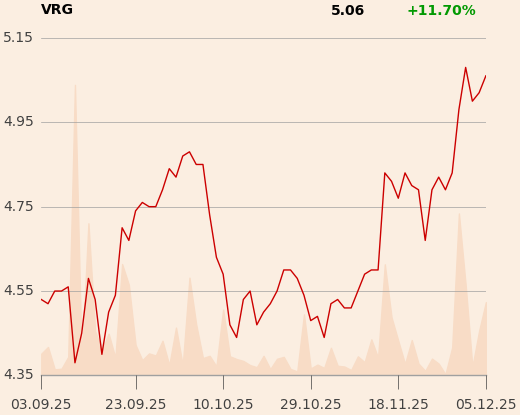 "W związku z lepszymi od naszych założeń wynikami w 3Q’25, zakomunikowanym przez zarząd oczekiwaniem dobrego 4Q’25 oraz celów dla 2026, zrewidowaliśmy nasze prognozy na cały 2025 r. i kolejne lata. Od poprzedniej wyceny wzrosły również wskaźniki wyceny dla firm porównawczych oraz spadły rentowności obligacji skarbowych, będące w naszej wycenie bazą do obliczania stopy dyskonta. W efekcie zmieniamy cenę docelową dla akcji VRG z 5,57 zł do 6,27 zł za akcję i utrzymujemy rekomendację kupuj" - napisano w rekomendacji.