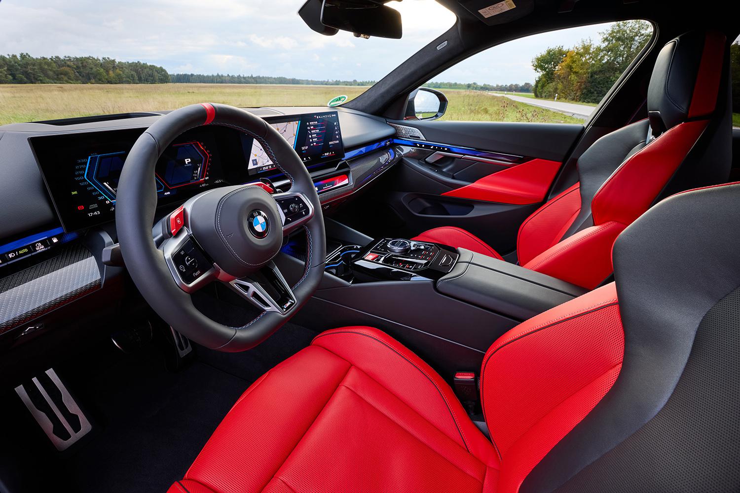 Jak owa ociężałość przekłada się na osiągi? No cóż. G99 jest nie tylko największym M5 w kombi, jest też najmocniejszym. Kolejną nowością jest to, że M5 Touring jest hybrydą plug-in i tylko nią. Za to przepotężną. To dosłownie najmocniejsze rodzinne kombi. Komitywa silnika V8 biturbo o pojemności 4,4 l z 197-konną zintegrowaną z ośmiostopniową skrzynią M Steptronic jednostką elektryczną dostarczają na obie osie aż 727 KM i równiutki tysiąc nanometrów momentu obrotowego. Szok! Zainstalowana na pokładzie bateria (18,6 kWh netto) pozwala na pokonanie około 55 km na samym prądzie, a wspomniana komitywa V8 z elektrykiem zapewnia zgoła inne doświadczenia. Ten ekspresowy rodzinno-bagażowy przecinak katapultuje się od 0 do 100 km/h w 3,6 s. Przestaje się rozpędzać, gdy na prędkościomierzu zobaczysz 305 km/h (jeśli wcześniej – za dopłatą, rzecz jasna – zdejmiesz fabryczne ograniczenie do 250 km/h). Te fakty wespół z informacją o bardzo przyzwoitej przestrzeni bagażowej (500 l, a po złożeniu tylnej kanapy 1630 l) czynią z najnowszego M5 Touring autostradowego shinkansena. Dosłownie. Mimo oczywistych sportowych aspiracji M5 G99 jest też – albo inaczej – potrafi być komfortowym pojazdem dalekobieżnym. Potrafi też…