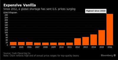 Zapotrzebowanie ze strony największych producentów takich jak Nestle czy Whole Foods Market Inc. gwałtowanie więc wzrosło, co szybko spowodowało również wzrosty cen. Jeszcze w 2012 r. za 1 kg lasek wanilii płacono w USA 20 USD, dzisiaj jest to 250 USD.