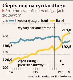 Mimo niepewności, która wciąż utrzymuje się wobec rynków wschodzących, i ryzyka, jakie czyha na sektor finansowy w Polsce w związku z rodzącą się w pałacu prezydenckim ustawą frankową, inwestorzy zagraniczni wciąż widzą biznes w naszym długu. Nawet słabe notowania, jakie mamy ostatnio u agencji ratingowych, tego nie zmieniają, chociaż rentowności nie są tak niskie jak kilka miesięcy temu. W maju nierezydenci dokupili papierów skarbowych za ponad 4 mld zł. Ich portfel jest wciąż niższy od stanu na koniec ubiegłego roku o ponad 14 mld zł, ale w ostatnich miesiącach kapitał nie ucieka znad Wisły. To głównie zasługa tego, że na tle wielu gospodarek mamy relatywnie wysokie stopy procentowe i wciąż dajemy zarobić przy umiarkowanym ryzyku. W maju zagranica, tak jak w poprzednim miesiącu, rezygnowała z obligacji zapadających w horyzoncie roku, ale zwiększyła zaangażowanie w te z datą wykupu za 2-7 lat (o 2,1 mld zł) i zapadające za co najmniej 7 lat (o 3,1 mld zł). Fiskus twierdzi, że w czerwcu trend został utrzymany. Nadal aktywne na zakupach są krajowe banki. To cały czas zasługa podatku bankowego, z którego dług sprzedawany przez fiskusa jest wyłączony. Od kiedy w lutym weszła nowa danina, banki kupiły obligacje za 41 mld zł, dwukrotnie więcej niż w 2015 r. Największe uznanie bankowców ma jednak dług krótkoterminowy, do którego nie ma sentymentu zagranica. © Ⓟ