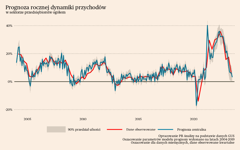 Na podstawie historycznych zależności szacujemy, że roczna dynamika przychodów powinna zwalniać. Wynosi ona obecnie ok. 3,2 proc. (+/- 3,95 pkt. proc.). Ostatnie dane gospodarcze były zgodne z naszymi szacunkami, opartymi na bieżących danych makroekonomicznych. W drugim kwartale przychody wzrosły o 5,5 proc. r/r, w porównaniu do wzrostu o 17,5 proc. r/r w pierwszym kwartale.