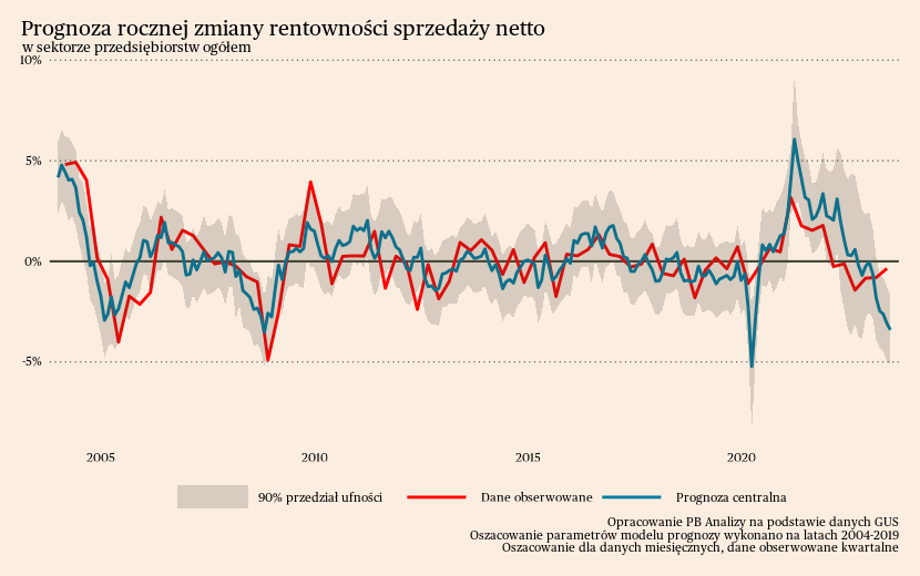 Aktualna kondycja polskiej gospodarki wskazuje, że rentowność przedsiębiorstw powinna maleć, ale dzieje się tak tylko w minimalnym stopniu. Na podstawie relacji historycznych szacujemy, że roczna zmiana rentowności sprzedaży powinna w lipcu wynosić około -3,4 pkt. proc. (+/- 1,7 p. p.). Tymczasem w drugim kwartale rentowność spadła jedynie o 0,03 p. p. Wysoka niepewność oszacowania wynika z dużej zmienności danych, zróżnicowania sytuacji ekonomicznej w różnych obszarach gospodarki oraz zastosowanych strategii adaptacji przedsiębiorstw do zmieniających się warunków gospodarczych.