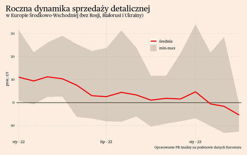 W sprzedaży detalicznej sytuacja gwałtownie się pogorszyła i wszystkie kraje mają już roczną dynamikę sprzedaży detalicznej na minusie. Wyczerpała się poduszka bezpieczeństwa w postaci wykorzystania zakumulowanych oszczędności oraz zwiększenia liczby konsumentów przez napływ uchodźców. We wszystkich krajach odczuwalny jest kryzys kosztów życia, który obniża realne dochody dyspozycyjne ludności. W następnych miesiącach dynamika sprzedaży może być dalej ujemna ze względu na spadek dochodów dyspozycyjnych ludności oraz przesunięcie popytu w kierunku usług. Jedyny wyjątek mogą tutaj stanowić Słowenia, Chorwacja oraz Bułgaria, w których napływ turystów może podbić sprzedaż w sklepach. Z uwagą należy obserwować sytuację w Polsce, bo tutaj widać pewne symptomy odwracania trendu w sprzedaży.