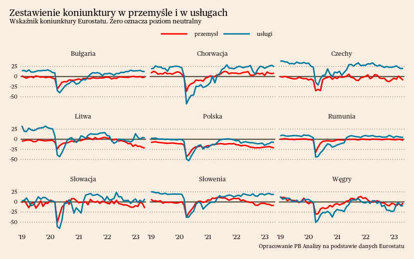 Słabe wyniki przemysłu oraz handlu detalicznego nie oddają jednak pełnego obrazu gospodarki. Ze względu na przesunięcie popytu w kierunku usług, aktywność gospodarcza może być podtrzymywana przez przedsiębiorstwa powiązane z usługami. Widać to we wskazaniach indeksów koniunktury. We wszystkich krajach sektory usługowe są w znacznie lepszej kondycji od przemysłu. Koniunktura w usługach zazwyczaj powróciła do stanu sprzed pandemii, podczas gdy w przemyśle postępuje załamanie. Czynniki podtrzymujące popyt w sektorze usług muszą dotyczyć szerokiego spektrum rynku, ponieważ w poszczególnych krajach kompozycja sektora jest bardzo odmienna, a mimo to wszędzie utrzymuje się dobra koniunktura.