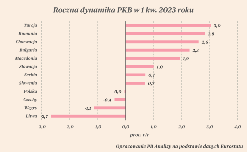 Dla większości krajów znamy już dane o wzroście gospodarczym w 1. kwartale 2023 roku. Grupa Wyszehradzka radzi sobie zdecydowanie najgorzej w całym regionie. Przyczyną jest mocne uderzenie szoku energetycznego oraz relatywnie dobre wyniki w zeszły roku, dlatego gospodarka dopiero teraz spowalnia. Największy wzrost PKB zanotowała Turcja przez przegrzanie gospodarki, skutkujące najwyższą inflacją w regionie i jedną z najwyższych na świecie. Dalej w stawce znajduje się Rumunia, która rok temu nie miała aż tak mocnego wzrostu PKB, więc dziś w połączeniu z napływającymi inwestycjami ma solidną podstawę do wzrostu. Bułgaria oraz Chorwacja zostały najmocniej pokiereszowane przez koronawirusa, zatem teraz ich gospodarki wracają na stare tory, pomimo niekorzystnego otoczenia makroekonomicznego.