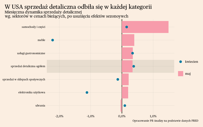 Podobnie pesymistyczny obraz popytu na dobra dają wyniki sprzedaży detalicznej. W cenach stałych sprzedaż detaliczna spadła w maju o 2,4 proc. r/r. Najważniejszym czynnikiem oddziałującym na wyniki sprzedaży detalicznej jest nasycenie rynku dobrami trwałymi, które skutkuje mniejszym popytem na meble i elektronikę. Trend wzrostu sprzedaży ogranicza się tylko do kategorii związanych z gastronomią i żywnością. Pierwsza branża korzysta na przesunięciu popytu w kierunku usług, druga na fakcie, że fluktuacje popytu na dobra podstawowe są niewielkie.