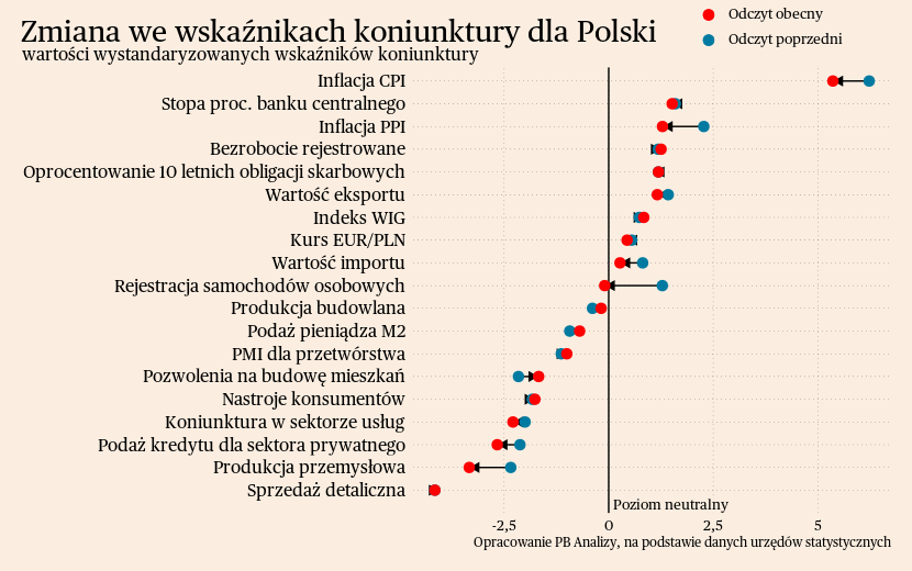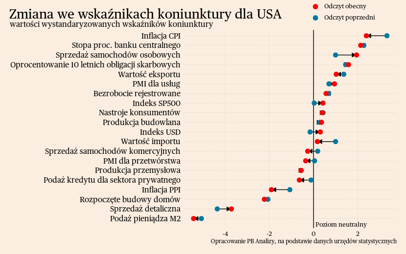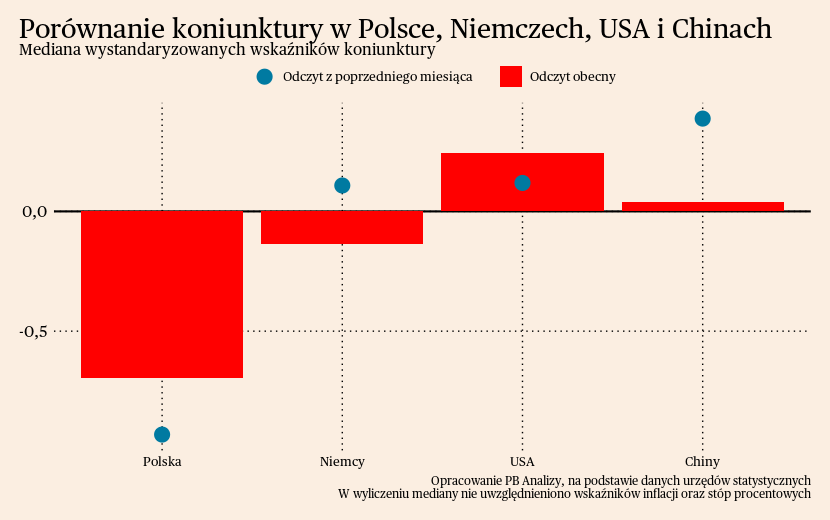 Mediana wskaźników w Polsce i USA poprawiła się, a obniżyła się w Niemczech oraz Chinach. Polska prezentuje się najgorzej ze wszystkich analizowanych gospodarek, ponieważ znajduje się na dnie cyklu koniunkturalnego. W Niemczech wskaźniki są wyraźnie wyżej, głównie za sprawą motoryzacji, która ratuje gospodarkę. W Stanach Zjednoczonych sytuacja jest relatywnie najlepsza. W Chinach zaś koniunktura ewidentnie zawodzi w stosunku do oczekiwań.