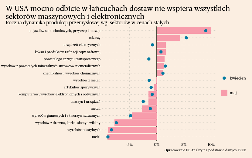 Pozytywny obraz inflacji oraz rynku pracy kontrastuje z wyraźnym spowolnieniem w obszarze sprzedaży i produkcji towarów. Produkcja przemysłowa wzrosła tylko o 0,2 proc. r/r w maju. Głównym motorem napędowym jest motoryzacja, korzystająca na luzowaniu napięć w łańcuchach dostaw. Jednocześnie inne sektory, które powinny korzystać na lepszych warunkach logistycznych, nie odnotowują wzrostu produkcji (w szczególności produkcja maszyn czy elektroniki). Wiele czynników wpływa bowiem na obniżenie produkcji przemysłowej. Jest to m.in. przesunięcie popytu w kierunku usług, odwrócenie cyklu zapasów, obniżająca produkcję dóbr pośrednich oraz nasycenie rynku dobrami trwałymi przejawiające się m.in. w słabych wynikach branży meblarskiej.