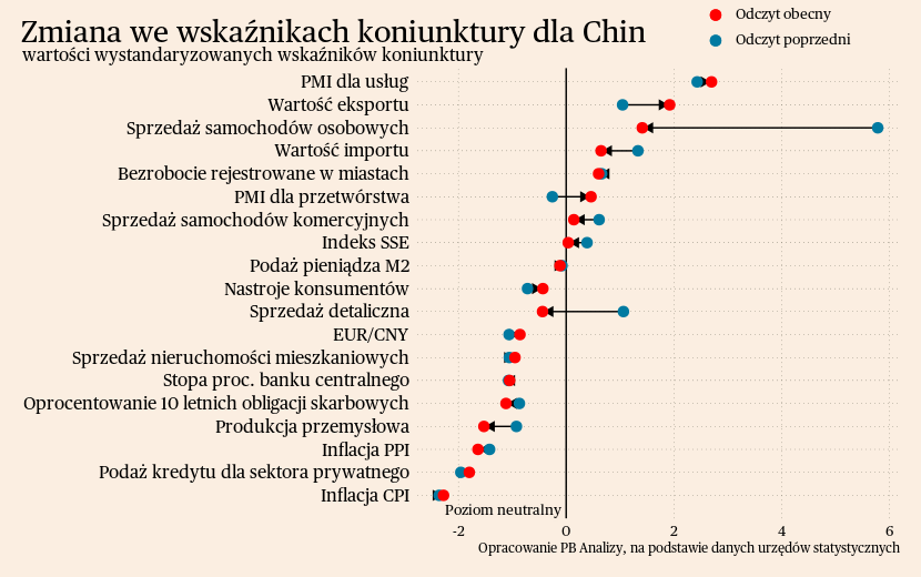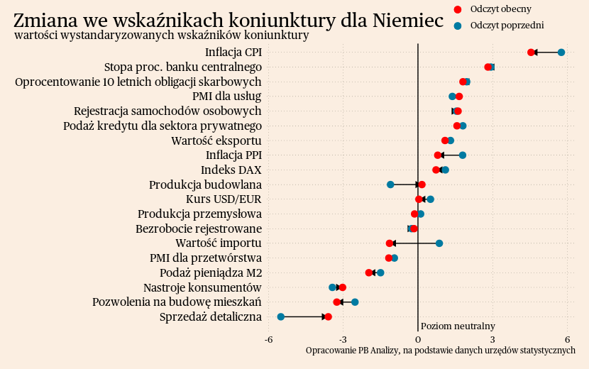 W każdy piątek aktualizujemy informację o stanie światowej gospodarki przez pryzmat 80 wskaźników z czterech gospodarek – Polski, Niemiec, Stanów Zjednoczonych i Chin. Wszystkie analizowane przez nas wskaźniki można obserwować i pobierać na naszej platformie danych PB Analizy. W analizie dane podajemy w wystandaryzowanej dynamice rocznej oraz w wystandaryzowanym odchyleniu od poziomu referencyjnego. Dzięki temu możemy porównywać dane o różnych cechach statystycznych i pokazywać odchylenia od długookresowego trendu.