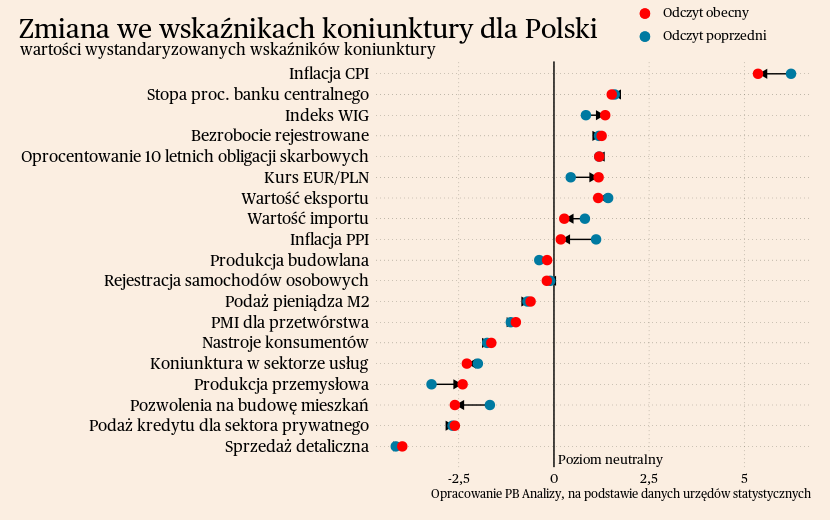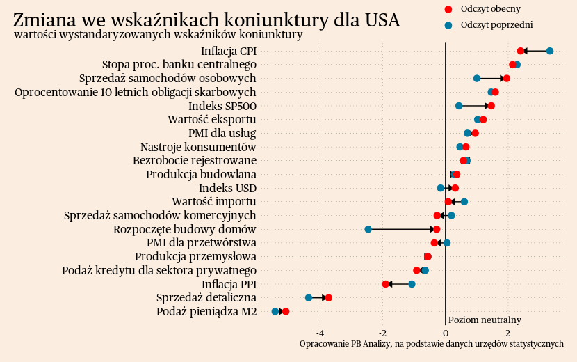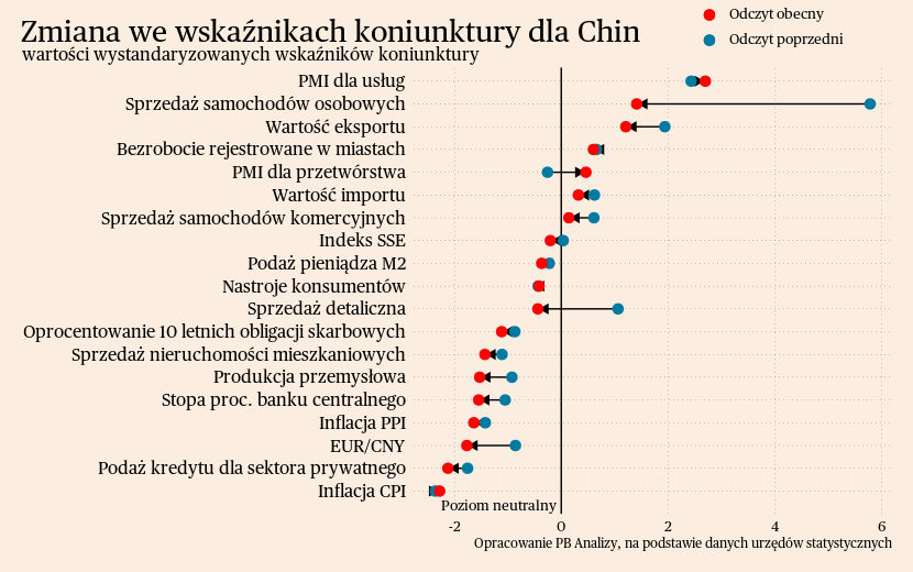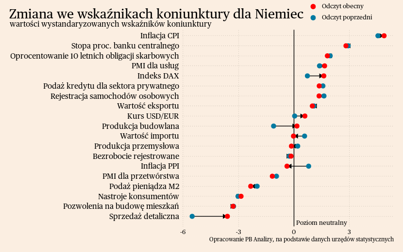 W każdym tygodniu aktualizujemy informację o kondycji światowej gospodarki przez pryzmat 80 wskaźników z czterech gospodarek – Polski, Niemiec, Stanów Zjednoczonych i Chin. Wszystkie analizowane przez nas wskaźniki można obserwować i pobierać na naszej platformie danych PB Analizy. W analizie dane podajemy w wystandaryzowanej dynamice rocznej. Dzięki temu możemy porównywać dane o różnych cechach statystycznych.