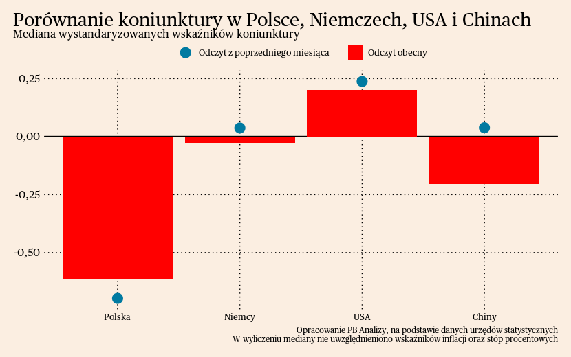 Mediana wskaźników w Polsce poprawiła się, a obniżyła w Niemczech, USA oraz Chinach. Polska prezentuje się najgorzej ze wszystkich analizowanych gospodarek, gdyż znajduje się na dnie cyklu koniunkturalnego. Bardzo mocno redukowany jest popyt na towary, przez spadek skłonności do konsumpcji oraz odwrócenie cyklu zapasów. W Niemczech wskaźniki niewiele zmieniły swój poziom, motoryzacja podtrzymuje aktywność całej gospodarki. W Stanach Zjednoczonych widać wręcz oznaki ożywienia koniunktury, szczególnie na rynku nieruchomości. W Chinach coraz bardziej na wierzch wychodzą problemy strukturalne gospodarki, a rząd rozważa wprowadzenie dużej stymulacji fiskalnej.