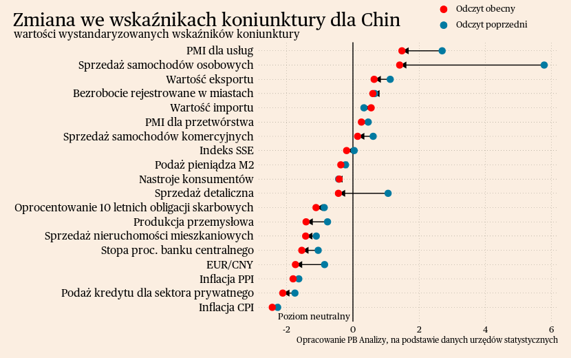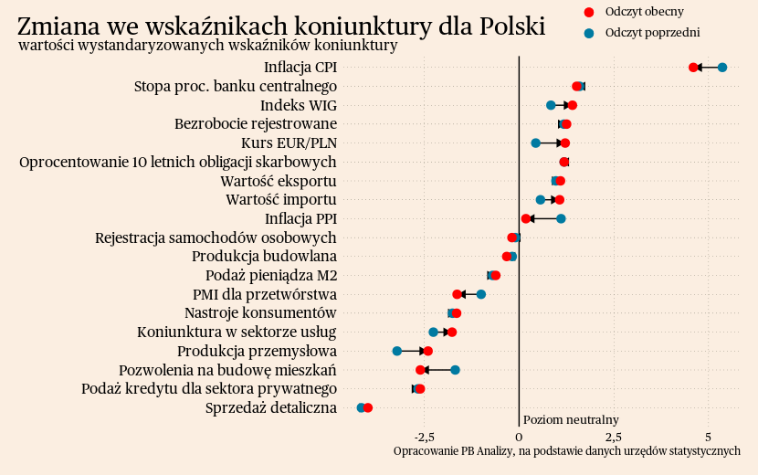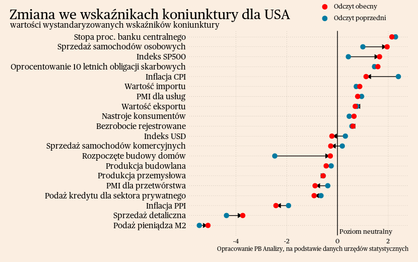 W każdym tygodniu aktualizujemy informację o kondycji światowej gospodarki przez pryzmat 80 wskaźników z czterech gospodarek – Polski, Niemiec, Stanów Zjednoczonych i Chin. Wszystkie analizowane przez nas wskaźniki można obserwować i pobierać na naszej platformie danych PB Analizy. W analizie dane podajemy w wystandaryzowanej dynamice rocznej oraz w wystandaryzowanym odchyleniu od poziomu referencyjnego. Dzięki temu możemy porównywać dane o różnych cechach statystycznych i pokazywać odchylenia od długookresowego trendu.