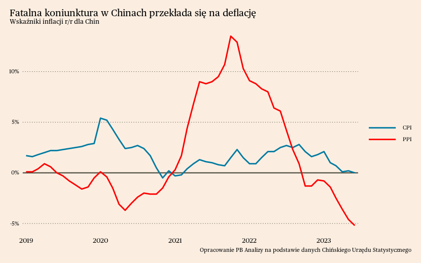 Chiny nie mogą się podnieść z marazmu gospodarczego po zniesieniu obostrzeń epidemicznych, czego najbardziej jaskrawym objawem jest balansowanie na krawędzi deflacji. W Chinach inflacja cen konsumentów wyniosła w czerwcu 0 proc. r/r, a po usunięciu zmian w cenach żywności -0,6 proc. r/r. Spowolnienie jest większe w sektorze dóbr, gdyż popyt przesuwa się w stronę usług. Jednak wzrost cen w sektorze usług jest wolniejszy, niż oczekiwano. Z jednej strony firmy nie odczuwają potrzeby podnoszenia cen, bo nie doświadczają presji kosztowej od strony wynagrodzeń. Z drugiej przesunięcie popytu nie jest na tyle wyraźne, aby firmy miały przestrzeń do podnoszenia cen.