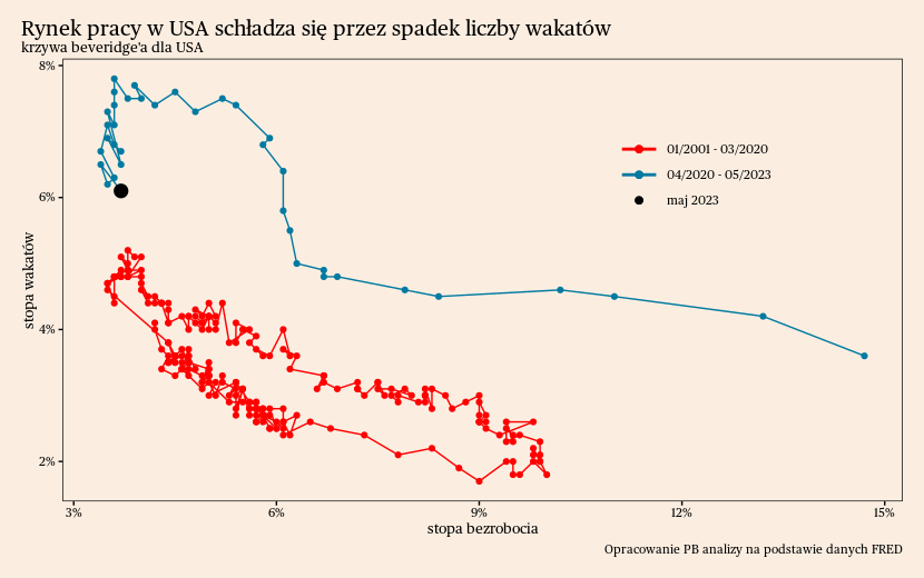 Dezinflacji sprzyjać będą także trendy na rynku pracy. Dostosowanie zachodzi tam przez spadek stopy wakatów, a nie wzrost bezrobocia. Widać to bardzo wyraźnie na krzywej Beveridge'a. Ostatnie wskazania idą pionowo w dół, czyli przy nie zmienionej stopie bezrobocia spada stopa wakatów. Oznacza to, że poprawia się efektywność rynku pracy, co zmniejszy presję na wzrost wynagrodzeń. Stopa bezrobocia w czerwcu wyniosła 3,6 proc., czyli utrzymuje się w okolicach najniższych od 50 lat.
