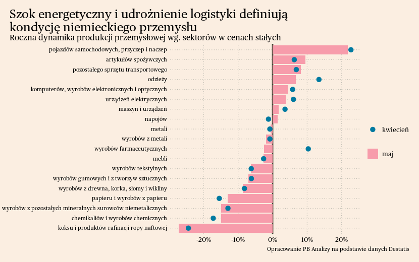 W niemieckim przemyśle zbiera się coraz więcej negatywnych zjawisk. W maju produkcja przemysłowa wzrosła tylko o 0,7 proc. r/r (w kwietniu +1,7 proc. r/r). Najszybciej spadała produkcja w sektorach energochłonnych, dotkniętych przez kryzys energetyczny. Zima i szczyt wzrostu cen są już ponad kwartał za nami, jednak w warunkach skrajnie wysokiej niepewności firmy ograniczały zamówienia na produkty energochłonne. Na przeciwnym biegunie znajdują się sektory korzystające ze stabilizacji łańcuchów dostaw. Poprawa warunków logistycznych sprawiła, że producenci elektroniki oraz motoryzacji mogą bez przeszkód wypełniać zaległe zamówienia. Ponadto, producenci żywności wykorzystują spadające ceny surowców rolnych i zwiększają produkcję.