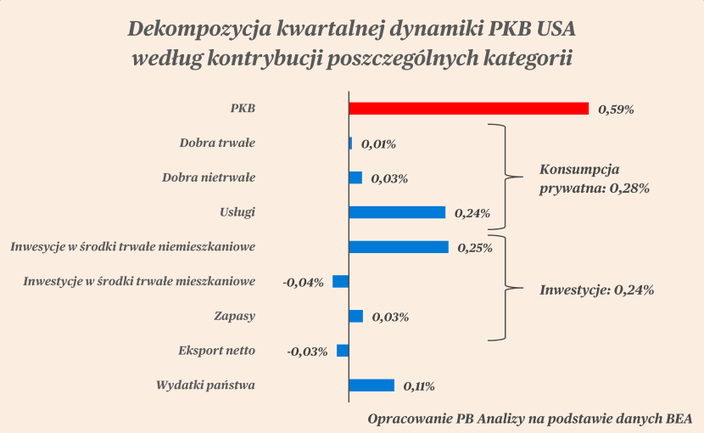 Wzrost gospodarczy w Ameryce napędzają usługi oraz inwestycje. W drugim kwartale 2023 roku realny PKB wzrósł o 2,56 proc. w porównaniu do tego samego okresu rok wcześniej, wobec 1,8 proc. wzrostu z poprzedniego kwartału. Natomiast w ujęciu kwartalnym, po usunięciu efektów sezonowych, wzrost wyniósł 0,6 proc. Najważniejszymi komponentami wzrostu były usługi oraz inwestycje w środki trwałe niemieszkaniowe, czyli inwestycje przedsiębiorstw. Usługi były napędzane przez przesunięcie popytu po pełnym zniesieniu obostrzeń pandemicznych. Z kolei inwestycje przedsiębiorstw stymulowane są przez korzystne regulacje (więcej na ten temat pisaliśmy tutaj) oraz poprawę warunków logistycznych, które umożliwiły realizację zaległych inwestycji.