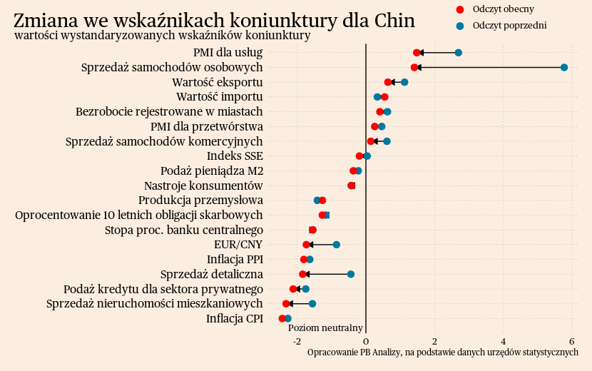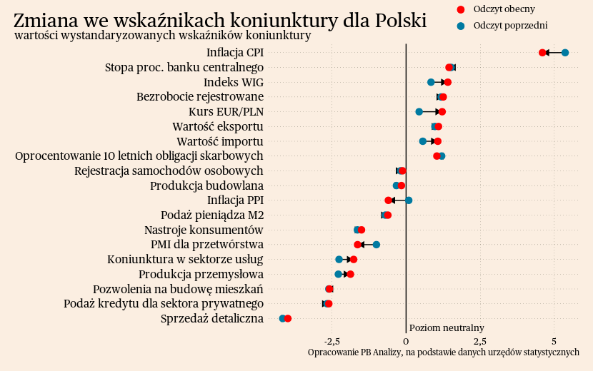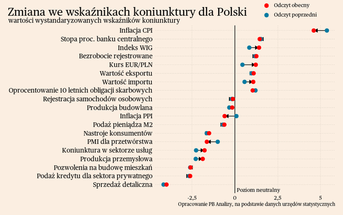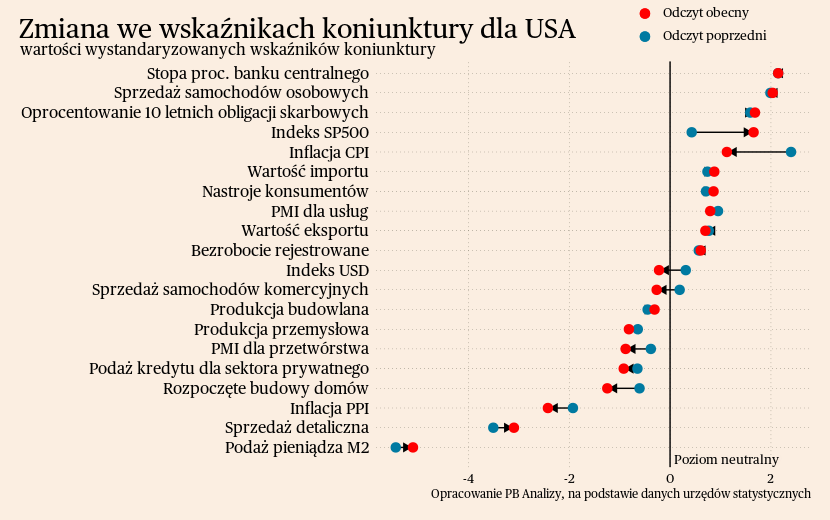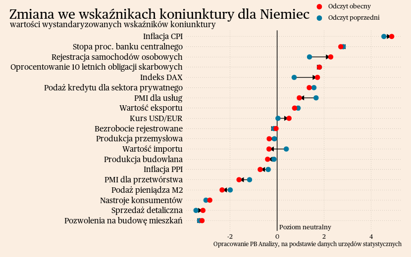 W każdym tygodniu aktualizujemy informację o kondycji światowej gospodarki przez pryzmat 80 wskaźników z czterech gospodarek – Polski, Niemiec, Stanów Zjednoczonych i Chin. Wszystkie analizowane przez nas wskaźniki można obserwować i pobierać na naszej platformie danych PB Analizy. W analizie dane podajemy w wystandaryzowanej dynamice rocznej oraz w wystandaryzowanym odchyleniu od poziomu referencyjnego. Dzięki temu możemy porównywać dane o różnych cechach statystycznych i pokazywać odchylenia od długookresowego trendu.