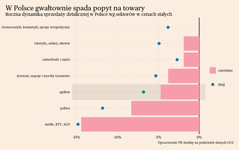 W Polsce obniża się popyt konsumentów. W czerwcu sprzedaż detaliczna spadła o 4,8 proc. r/r (przy spadku o 6,8 proc. r/r w maju). Wzrost rocznej dynamiki wynika tylko z efektu niskiej bazy. Głównymi przyczynami spadku skłonności do konsumpcji są obniżenie dochodów rzeczywistych, wzrost niepewności dochodów, przesunięcie popytu w kierunku usług oraz odpływ imigrantów. Spośród czynników sektorowych istotne jest nasycenie rynku dobrami trwałymi, które sprawia, że roczna dynamika sprzedaży mebli oraz sprzętu AGD jest najniższa ze wszystkich kategorii.