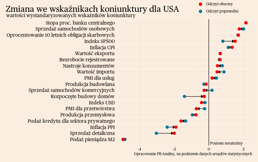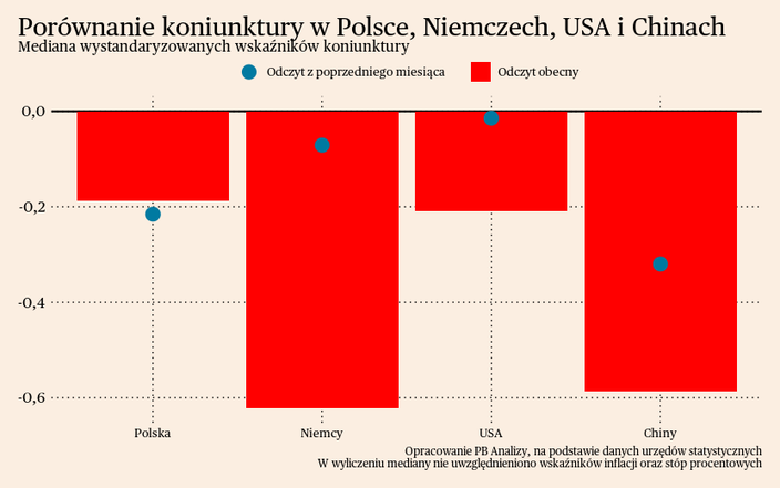 Mediana wskaźników wzrosła w Polsce, a obniżyła się w Niemczech, Stanach Zjednoczonych oraz Chinach. W Polsce dane wskazują, że chwilowo spowolniło ochłodzenie koniunktury w gospodarce, ale nie można wykluczyć nawrotu spowolnienia w najbliższych miesiącach. W Niemczech koniunktura najmocniej hamuje, co objawia się w danych o PKB oraz inflacji w przemyśle. Gospodarka Stanów Zjednoczonych trzyma się w dobrej formie, mimo trudności na rynku mieszkaniowym i chwilowego pogorszenia nastrojów konsumentów. W Chinach trwa marazm gospodarczy, na który Pekin nie ma odpowiedzi.