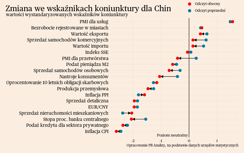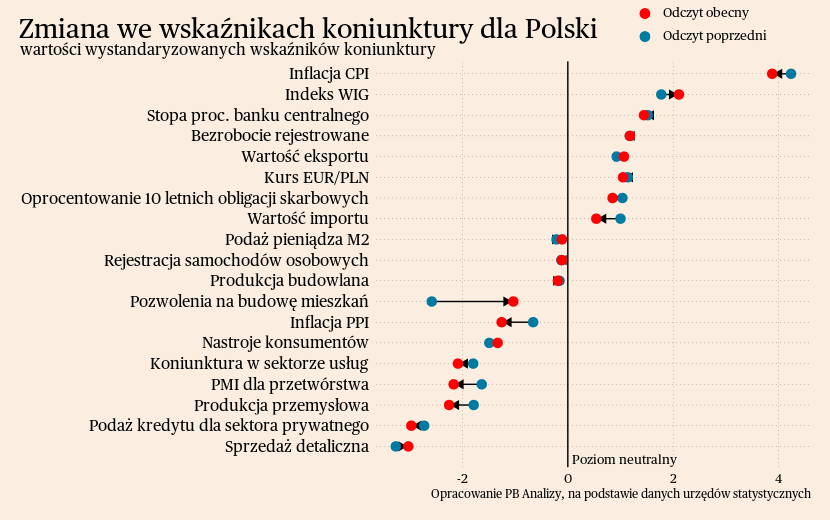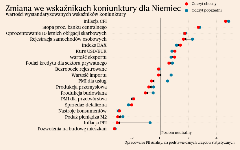 W każdym tygodniu aktualizujemy informację o kondycji światowej gospodarki przez pryzmat 80 wskaźników z czterech gospodarek – Polski, Niemiec, Stanów Zjednoczonych i Chin. Wszystkie analizowane przez nas wskaźniki można obserwować i pobierać na naszej platformie danych PB Analizy. W analizie dane podajemy w wystandaryzowanej dynamice rocznej oraz w wystandaryzowanym odchyleniu od poziomu referencyjnego. Dzięki temu możemy porównywać dane o różnych cechach statystycznych i pokazywać odchylenia od długookresowego trendu.