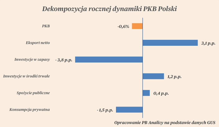 PKB – najszersza miara aktywności gospodarczej, dostępna kwartalnie i ze sporym opóźnieniem – spadł w Polsce w drugim kwartale o 0,6 proc. rok do roku. Za spadek w największym stopniu odpowiada odwrócenie cyklu zapasów oraz załamanie konsumpcji prywatnej. Nadzwyczaj dobrze wypadają eksport netto (dzięki redukcji importu) oraz inwestycje.