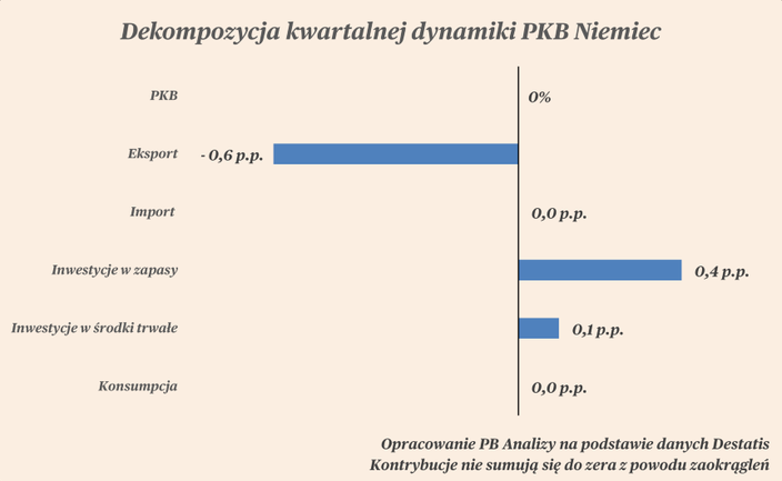 Największym wyzwaniem dla niemieckiej gospodarki jest słaby popyt zewnętrzny. Eksport spadł o 1,1 proc. kwartał do kwartału. Za większość spadku eksportu odpowiadają Europa Zachodnia oraz Chiny. W Europie sytuacja powinna się polepszać w najbliższych miesiącach. Szczyt kryzysu energetycznego już minął, powoli odbudowuje się wzrost dochodów realnych ludności. Większy problem stanowi sytuacja w Chinach. Nie zapowiada się na to, by w następnych miesiącach miało nastąpić ożywienie gospodarki Państwa Środka. Pesymizm wśród przedsiębiorstw jest powszechny, a Pekin nie ma pomysłów na to, jak rozwiązać problemy gospodarcze. Co gorsza, nawet jeśli Chiny poradziłyby sobie ze spowolnieniem gospodarczym, przeszkodą jest struktura eksportu Niemiec do tego kraju. Najważniejszymi produktami eksportowymi do Chin są samochody oraz maszyny przemysłowe. Niemiecka motoryzacja jest w tyle pod względem oferty samochodów elektrycznych i przegrywa w konkurencji z chińskimi markami. Popyt na maszyny przemysłowe zależy z kolei od inwestycji. Gospodarka Chin jest przeinwestowana, więc jeśli rząd zdecyduje się rozwiązać problemy strukturalne, jednym z nich będzie właśnie zmniejszenie stopy inwestycji.
