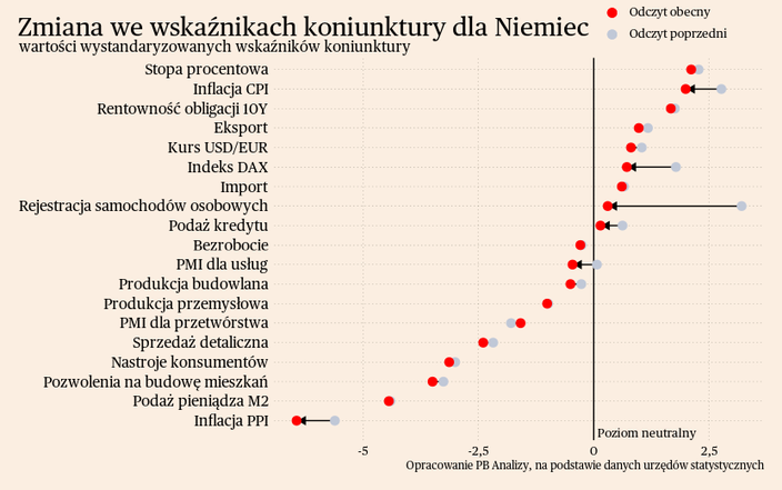 Jedynym pozytywnym aspektem schłodzenia gospodarki jest szybsza dezinflacja. W ostatnim miesiącu, według wstępnych szacunków, inflacja CPI w Niemczech do poziomu 3,8 proc. r/r i 0 proc. m/m. Jeżeli nie nastąpi gwałtowne odbicie gospodarcze, to dynamika indeksu cen konsumenckich powinna zmierzać do celu inflacyjnego.