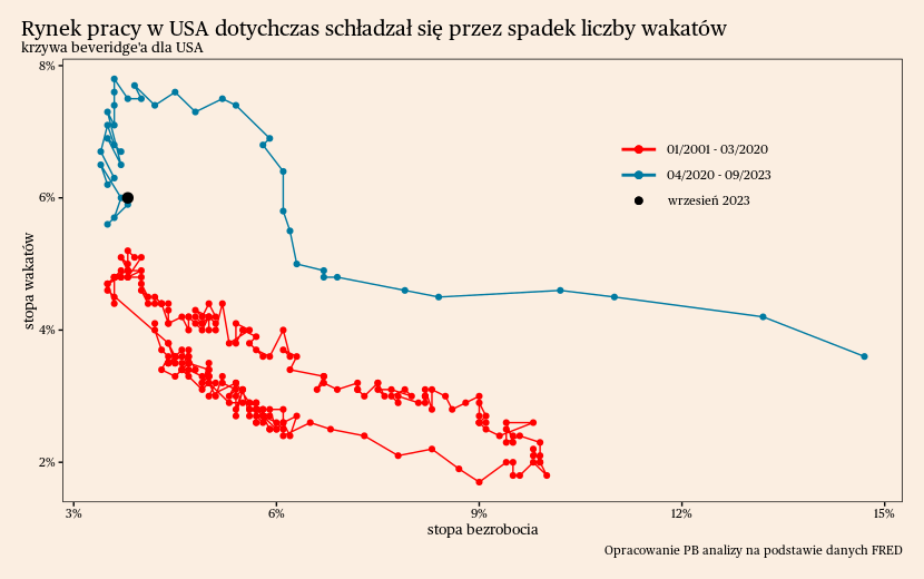 W Stanach Zjednoczonych sukcesywnie udaje się zbijać inflację bez pogorszenia sytuacji na rynku pracy. Ale na horyzoncie widać potencjalne zagrożenie dla dalszej dezinflacji – wzrost liczby wakatów. Rynek pracy dotychczas absorbował spowolnienie koniunktury poprzez redukcję liczby ofert pracy, czyli stopy wakatów. Stopa bezrobocia pozostawała na stałym poziomie. Jednakże w ostatnich miesiącach ten trend został przerwany, a spadek liczby wakatów nie jest kontynuowany. Może to oznaczać, że rynek pracy w USA stał się na trwałe bardziej nieefektywny niż przed pandemią, czyli nie potrafi połączyć pracowników z wolnymi miejscami pracy. Wakaty znów rosną, co może potencjalnie oznaczać większą presję na wzrost wynagrodzeń i cen. Byłaby to ważna przeszkoda do dalszego spowolnienia inflacji.